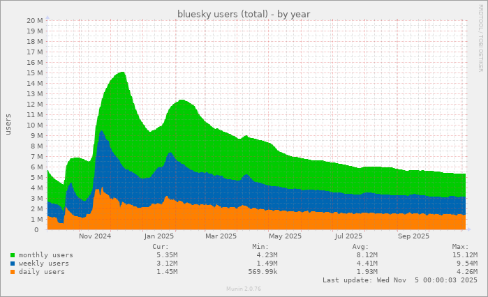 @transicorn the point is that Bluesky is declining just as well. The added problem for Bluesky is that continued funding via venture capital requires growth which they do not have at all. Both 5 million and 1 million are nothing compared to the likes of Threads or X which have a MAU in the hundreds of millions.